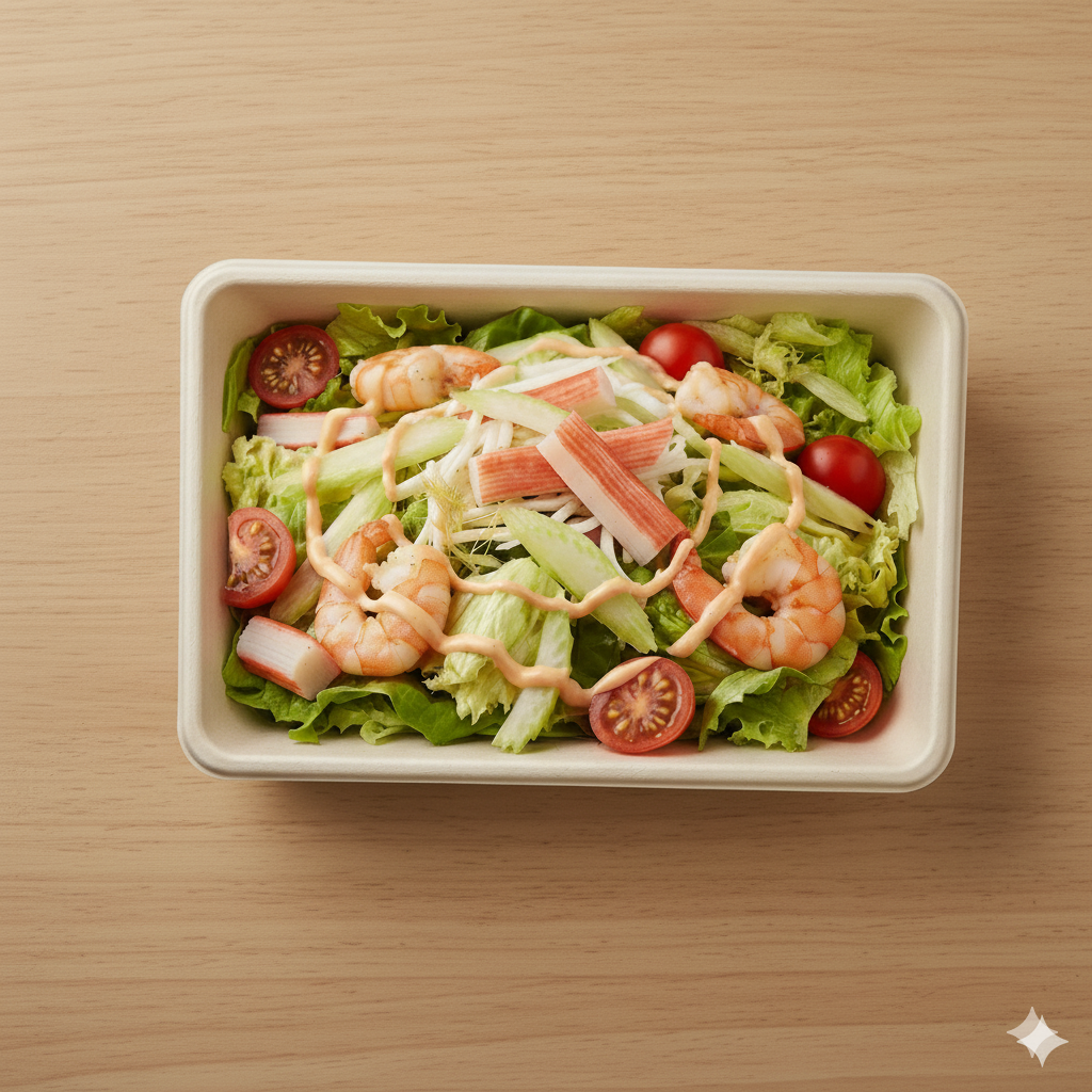 Ingredienti: Lattuga iceberg; sedano a julienne; finocchio a listelle; surimi di granchio; gamberetti saltati; salsa cocktail; pomodorini cherry.