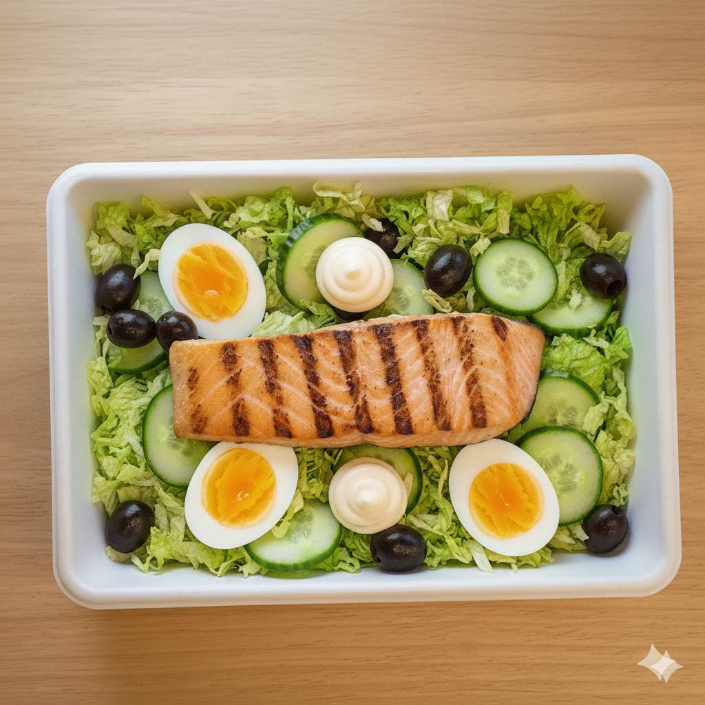 Ingredienti: Lattuga Iceberg; salmone grigliato; riso selvatico; olive nere; cetrioli; uova soda; maionese.