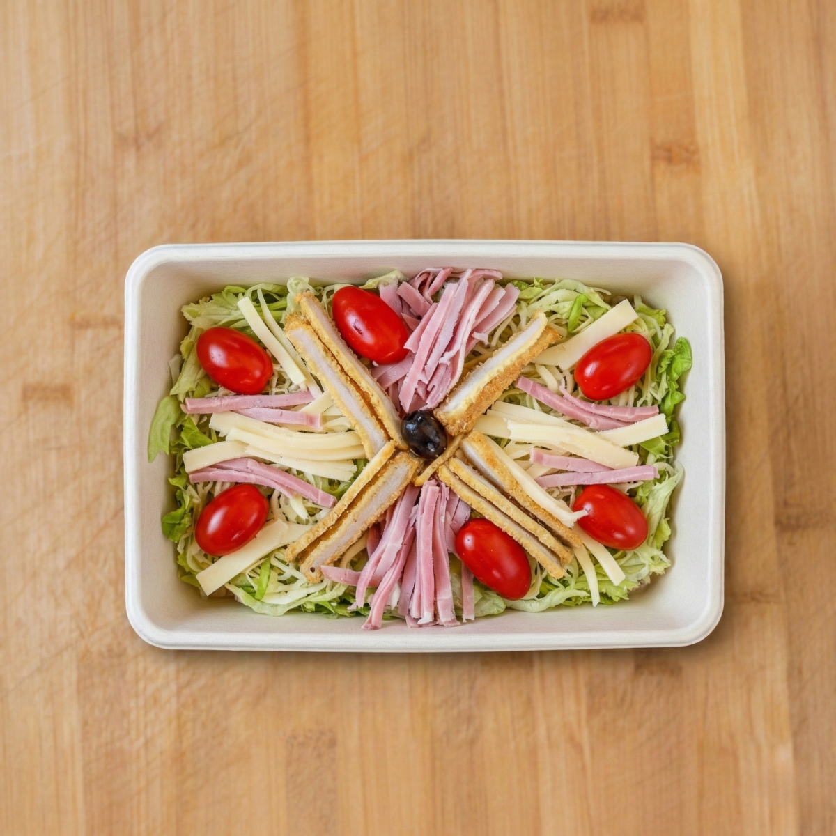 Ingredienti: lattuga iceberg; prosciutto cotto tagliato a bastoncini; edamer a bastoncini; tacchino a bastoncini; due fette di uova sode; olive nere.